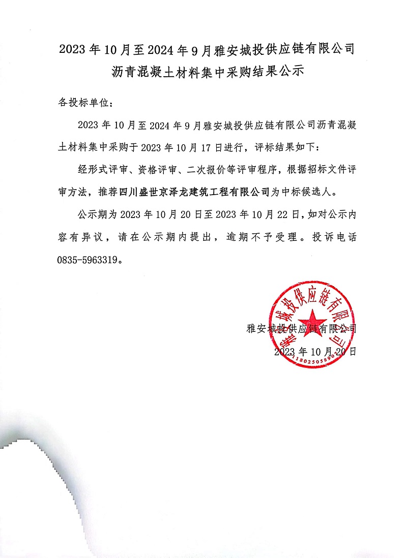 2023年10月至2024年9月雅安城投供應鏈有限公司瀝青混凝土材料集中采購結(jié)果公示