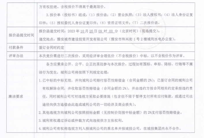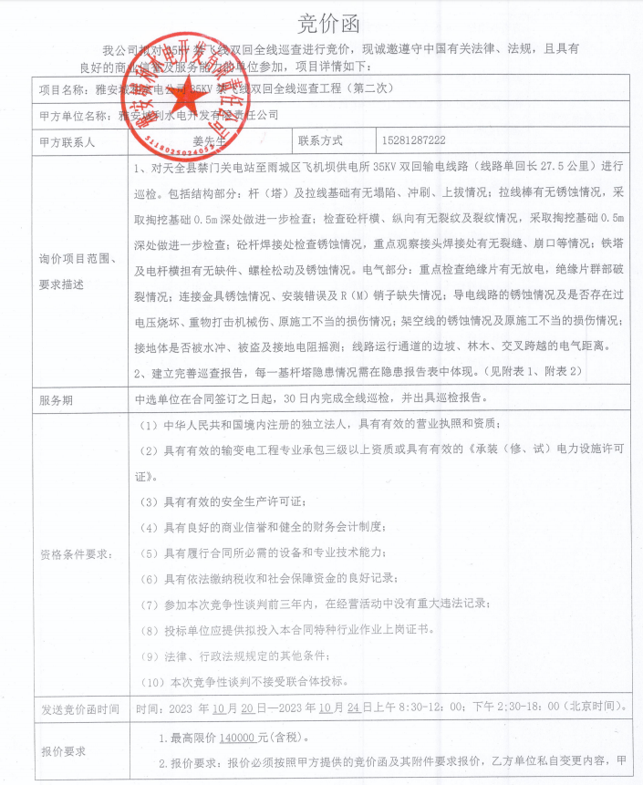 雅安城利水電公司35KV禁飛線雙回全線巡查工程(第二次)競(jìng)價(jià)公告
