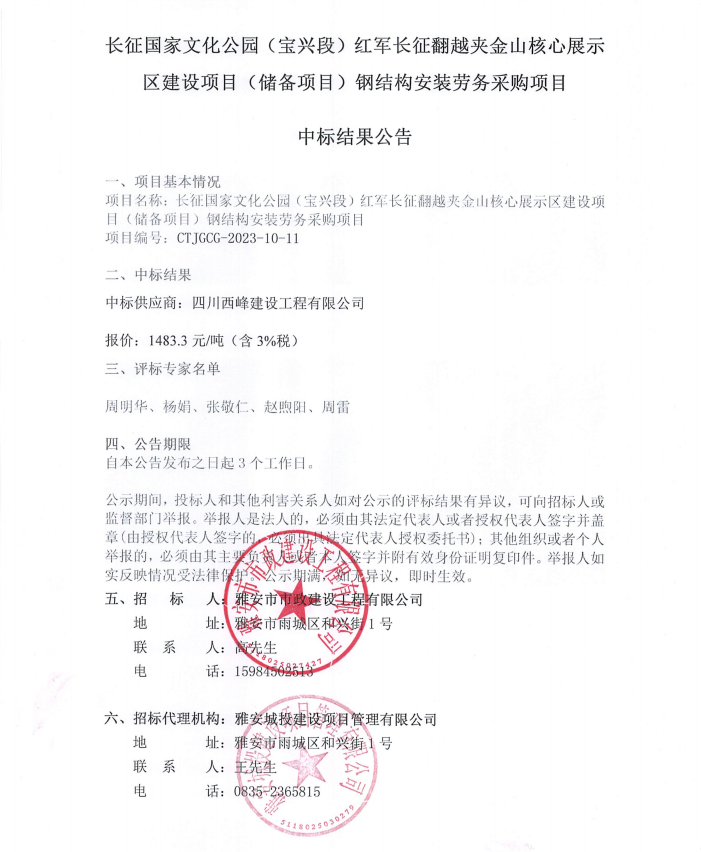 長征國家文化公園(寶興段)紅軍長征翻越夾金山核心展示區(qū)建設項目(儲備項目)鋼結構安裝勞務采購項目中標結果公告