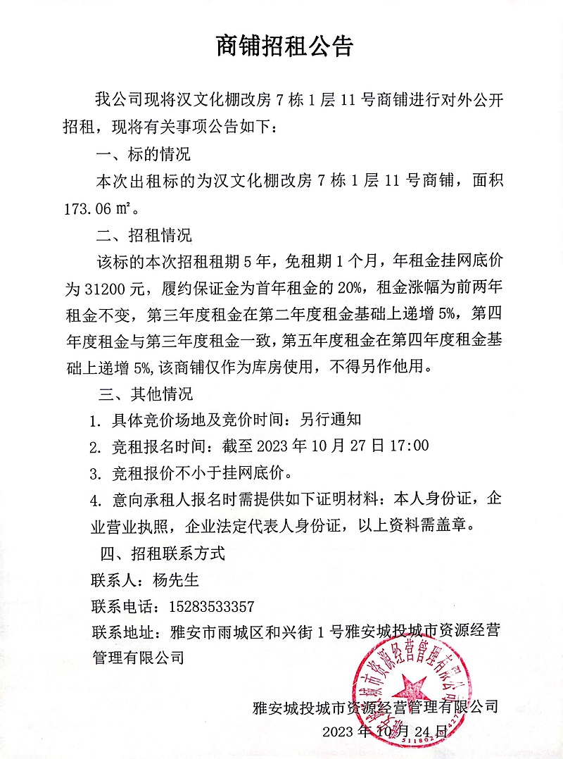 漢文化棚改房7棟1層11號商鋪招租公告