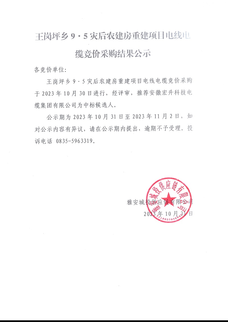 王崗坪鄉(xiāng)9.5災(zāi)后農(nóng)建房重建項(xiàng)目電線電纜競價(jià)采購結(jié)果公示
