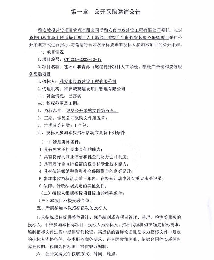蒼坪山和青鼻山隧道提升項目人工彩繪、噴繪廣告制作安裝服務(wù)采購項目公開采購邀請公告