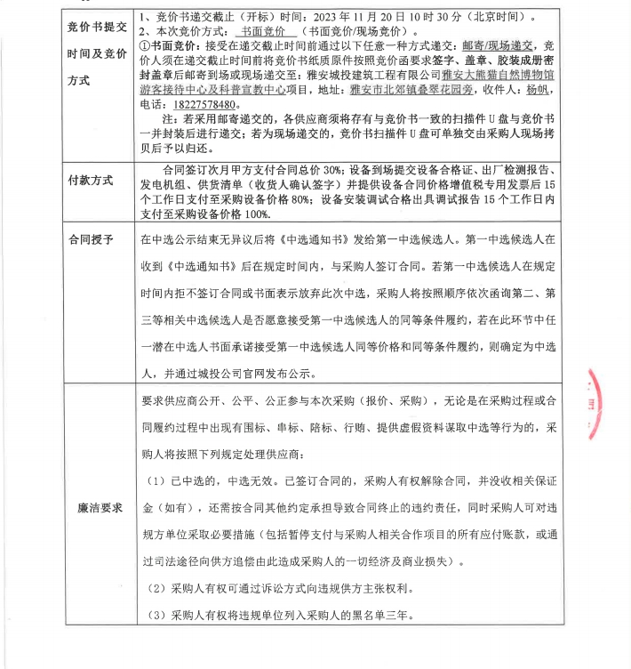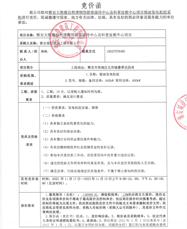 雅安大熊貓自然博物館游客接待中心及科普宣教中心項(xiàng)目柴油發(fā)電機(jī)組采購競(jìng)價(jià)公告