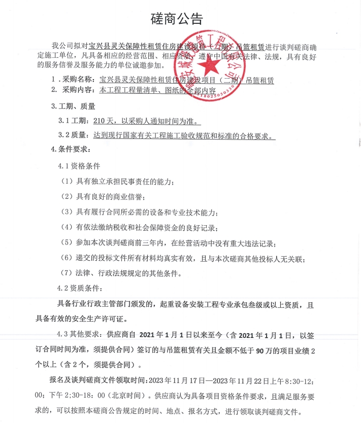 寶興靈關(guān)保障性租賃住房建設項目(二期)吊籃租賃談判磋商公告