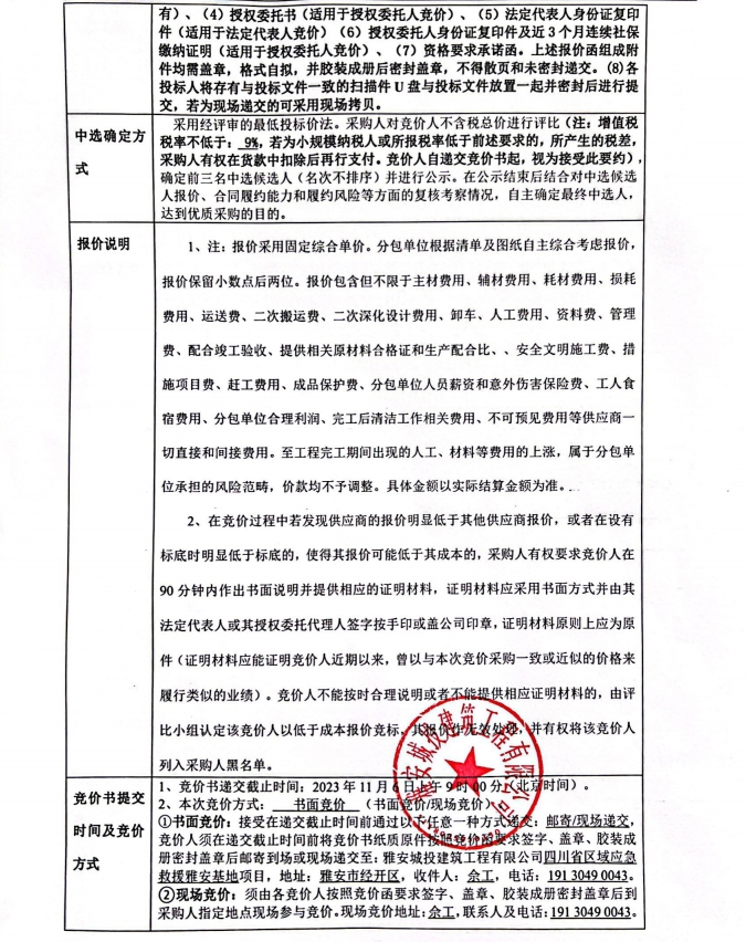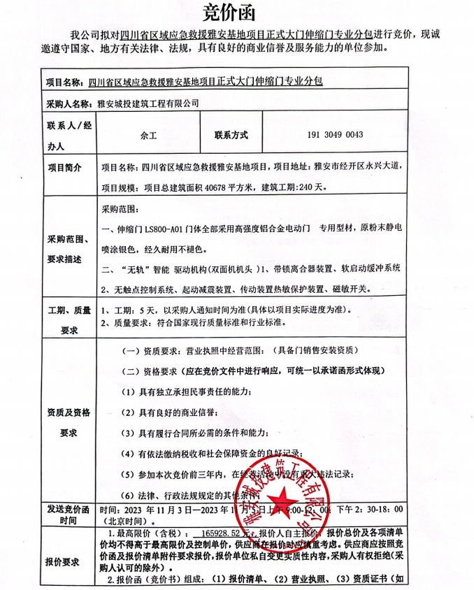 四川省區(qū)域應(yīng)急救援雅安基地項目正式大門伸縮門專業(yè)分包競價公告