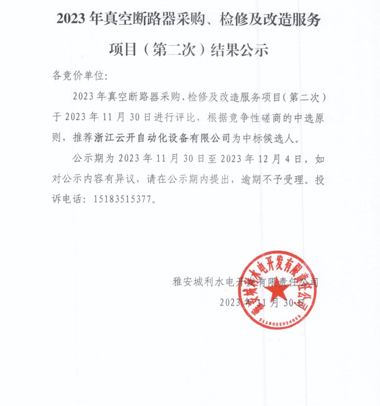 2023年真空斷路器采購、檢修及改造服務(wù)項(xiàng)目(第二次)結(jié)果公示