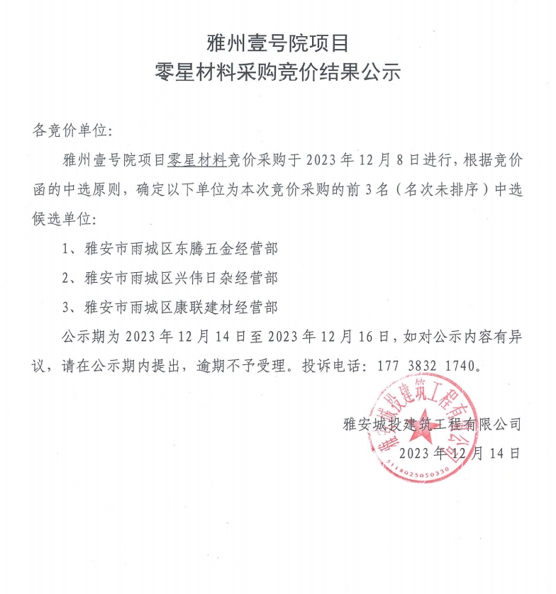 雅州壹號(hào)院項(xiàng)目零星材料采購競價(jià)結(jié)果公示