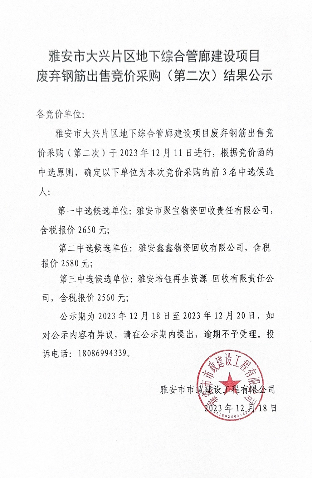 雅安市大興片區(qū)地下綜合管廊建設(shè)項(xiàng)目廢棄鋼筋出售競價采購(第二次)結(jié)果公示