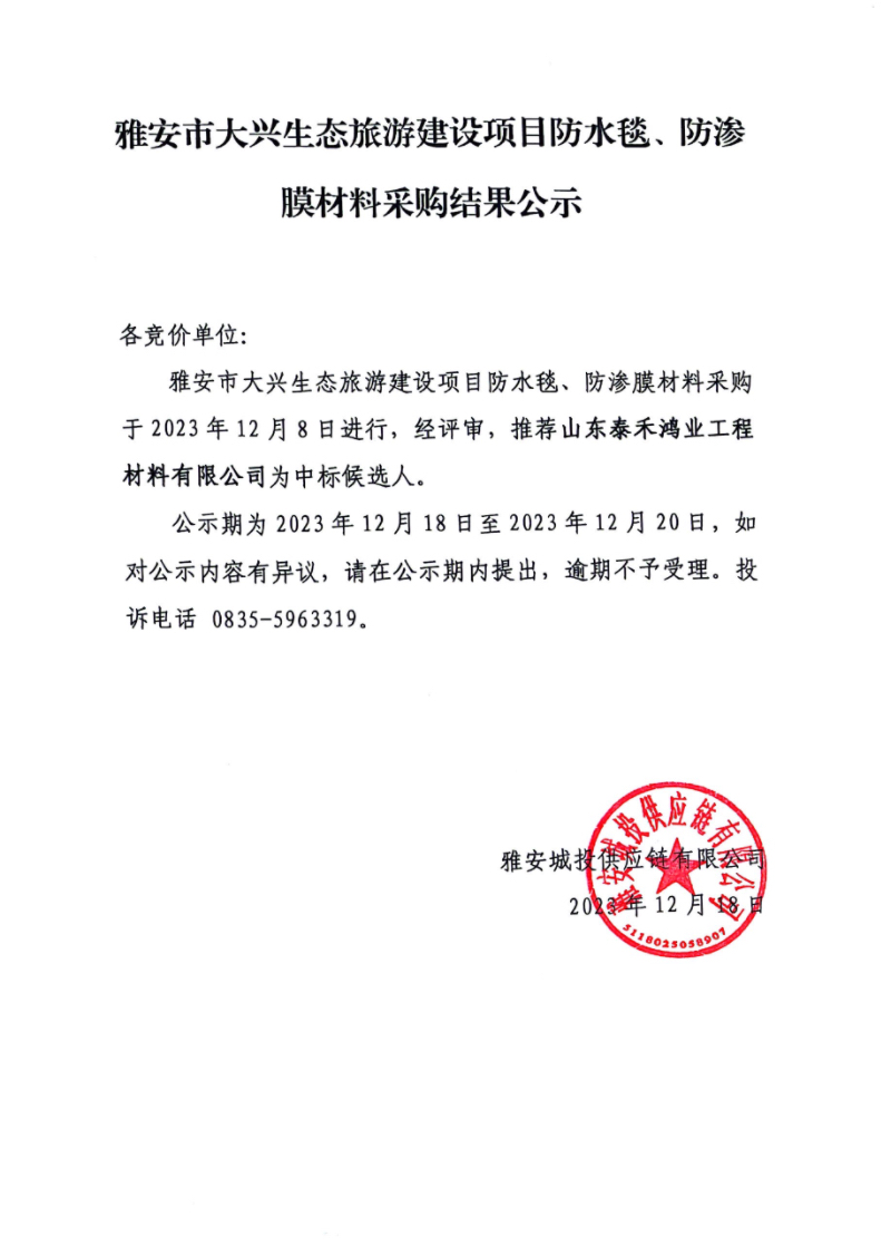雅安市大興生態(tài)旅游建設(shè)項(xiàng)目防水毯、防滲膜材料采購結(jié)果公示