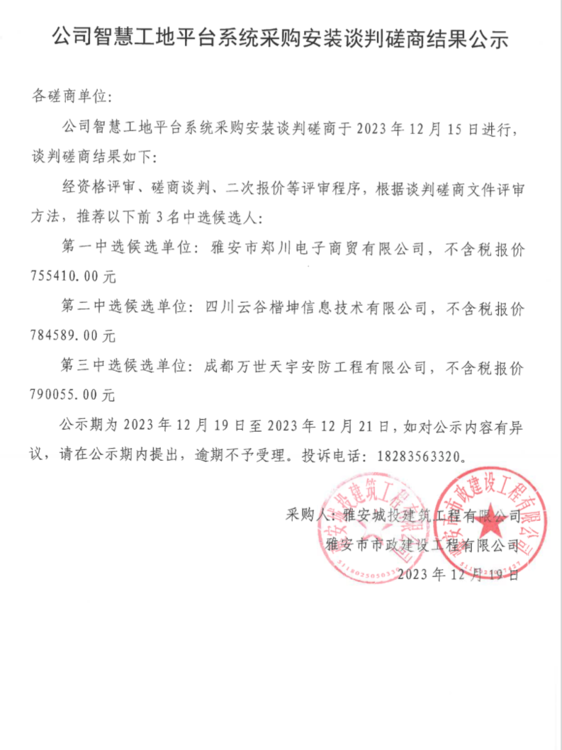公司智慧工地平臺(tái)系統(tǒng)采購安裝談判磋商結(jié)果公示