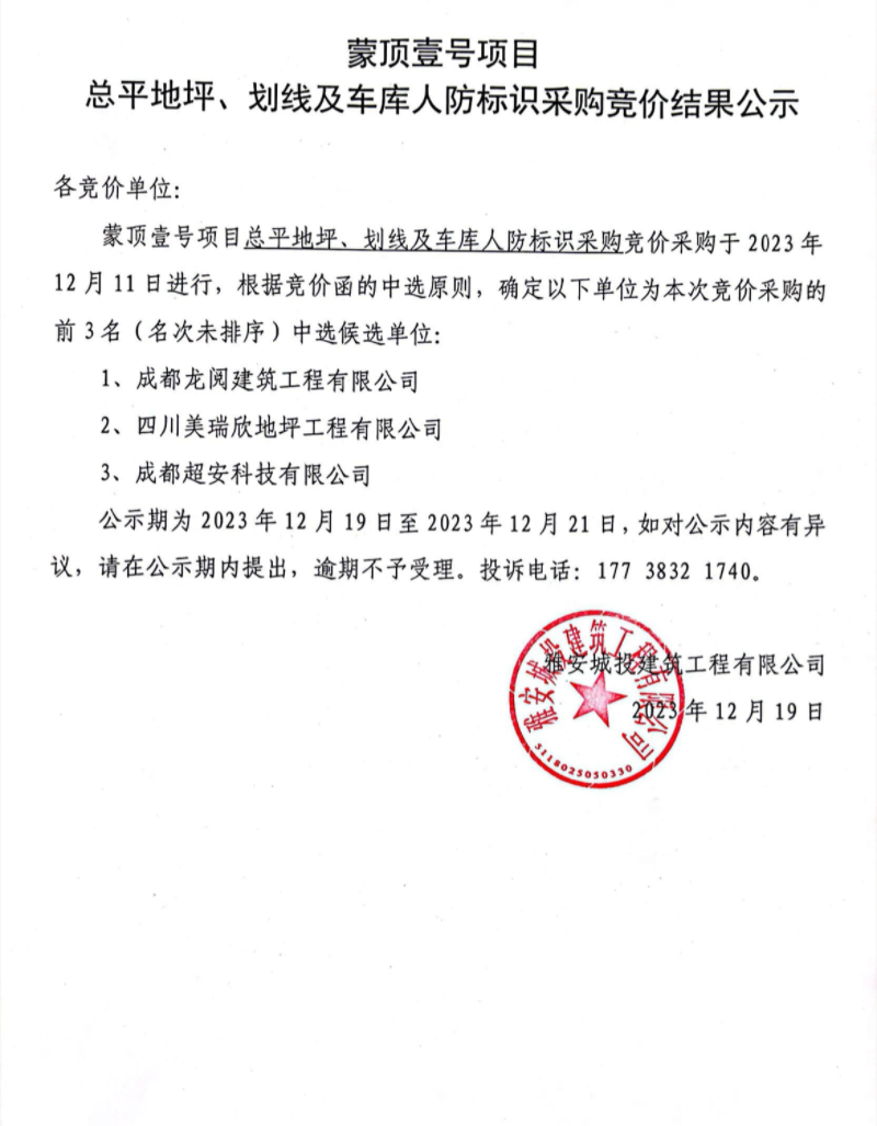 蒙頂壹號(hào)項(xiàng)目總平地坪、劃線及車庫(kù)人防標(biāo)識(shí)采購(gòu)競(jìng)價(jià)結(jié)果公示