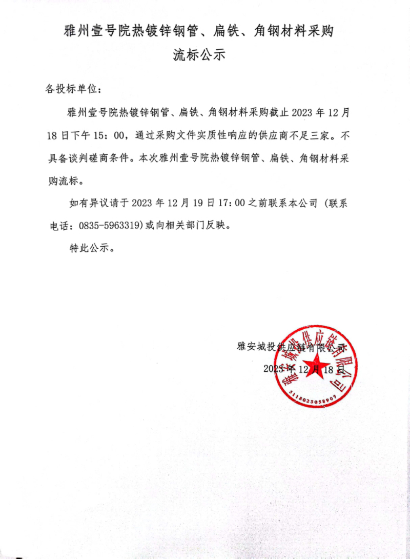 雅州壹號(hào)院熱鍍鋅鋼管、扁鐵、角鋼材料采購(gòu)流標(biāo)公示
