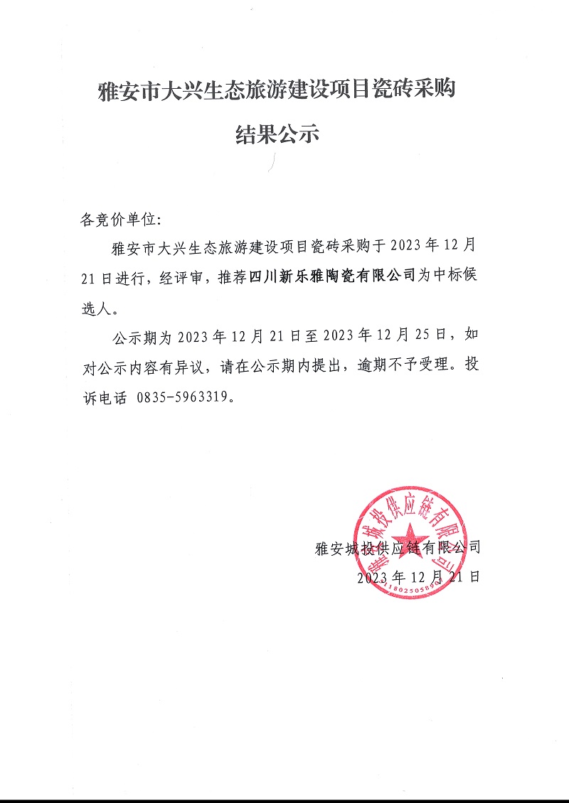雅安市大興生態(tài)旅游建設(shè)項(xiàng)目瓷磚采購(gòu)結(jié)果公示