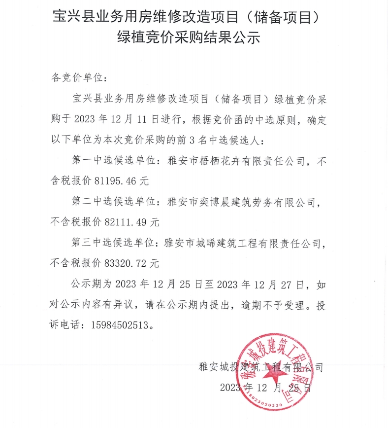 寶興縣業(yè)務(wù)用房維修改造項(xiàng)目(儲(chǔ)備項(xiàng)目)綠植競(jìng)價(jià)采購結(jié)果公示