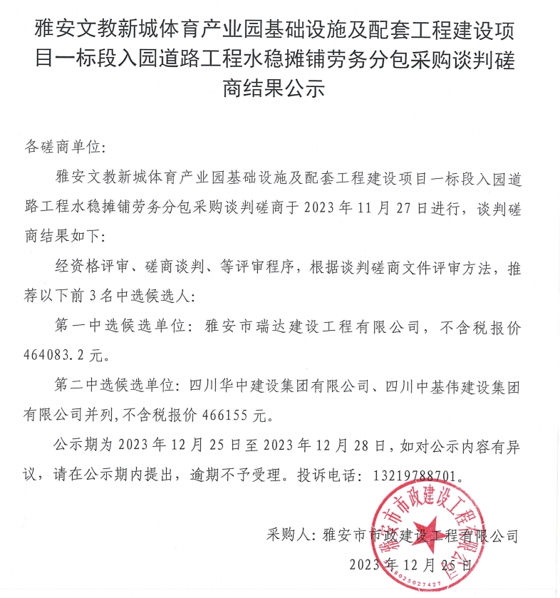 雅安文教新城體育產(chǎn)業(yè)園基礎設施及配套工程建設項目一標段入園道路工程水穩(wěn)攤鋪勞務采購談判磋商結(jié)果公示