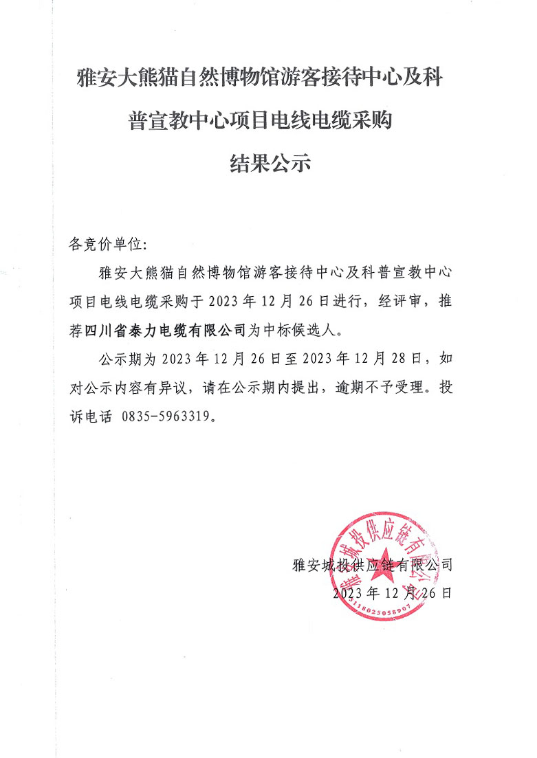 雅安大熊貓自然博物館游客接待中心及科普宣教中心項(xiàng)目電線(xiàn)電纜采購(gòu)結(jié)果公示