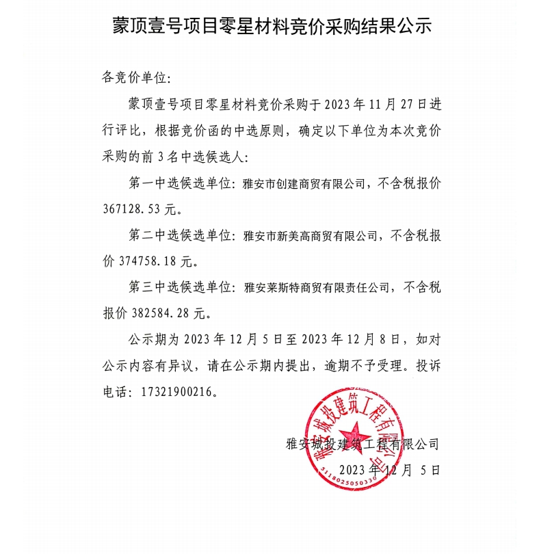 蒙頂壹號項目零星材料競價采購結(jié)果公示