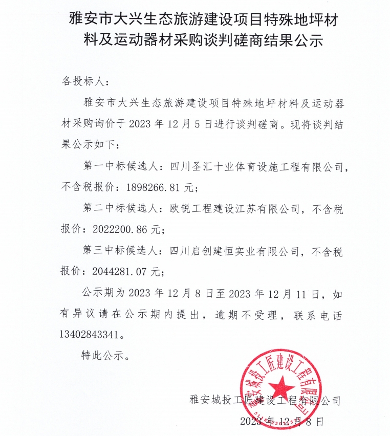 雅安市大興生態(tài)旅游建設(shè)項目特殊地坪材料及運動器材采購談判磋商結(jié)果公示