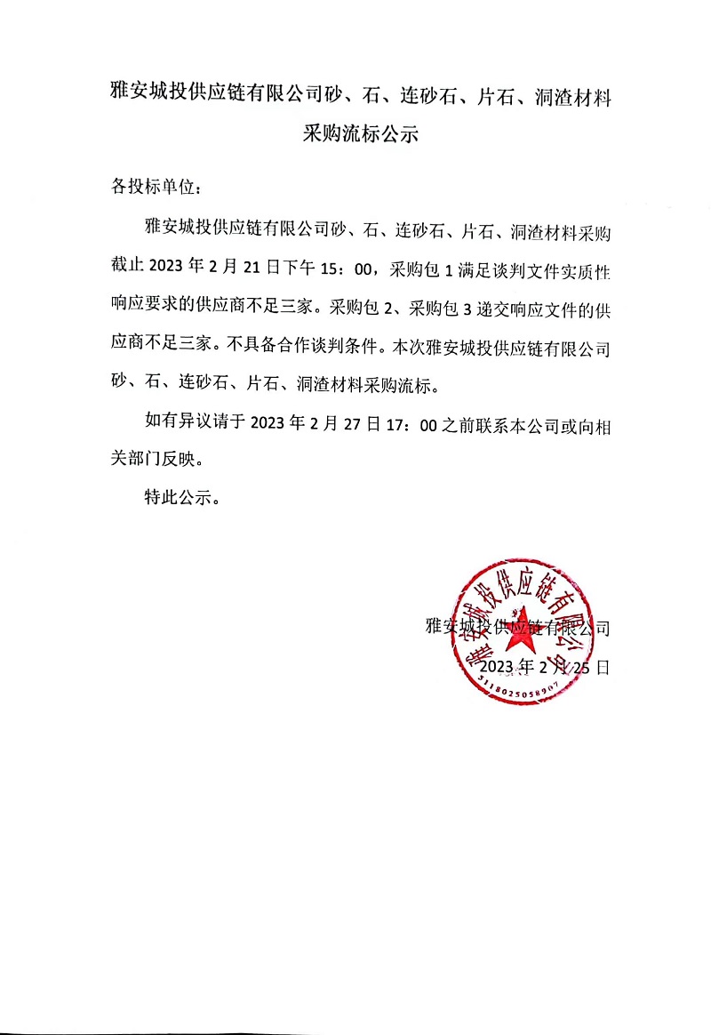 雅安城投供應(yīng)鏈有限公司砂、石、連砂石、片石、洞渣材料采購(gòu)流標(biāo)公示