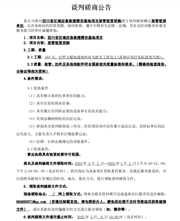 四川省區(qū)域應(yīng)急救援雅安基地項目架管租賃采購談判磋商公告