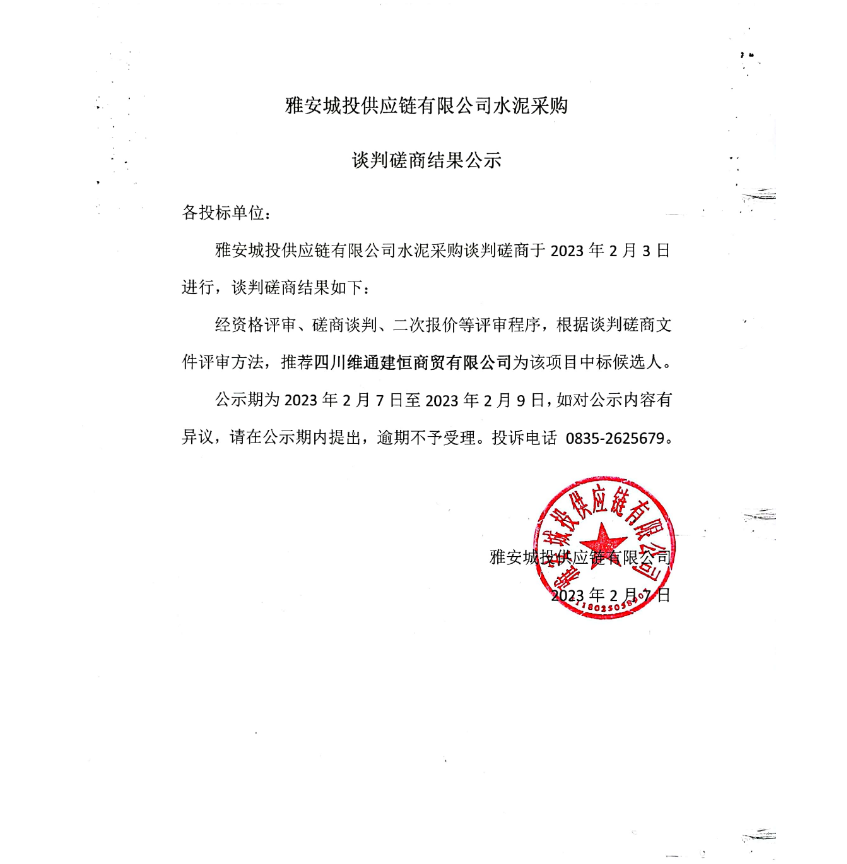 雅安城投供應(yīng)鏈有限公司水泥采購談判磋商結(jié)果公示