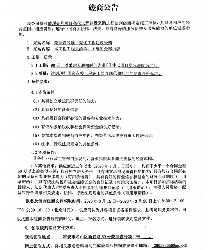 蒙頂壹號(hào)項(xiàng)目亮化工程建設(shè)采購(gòu)磋商公告