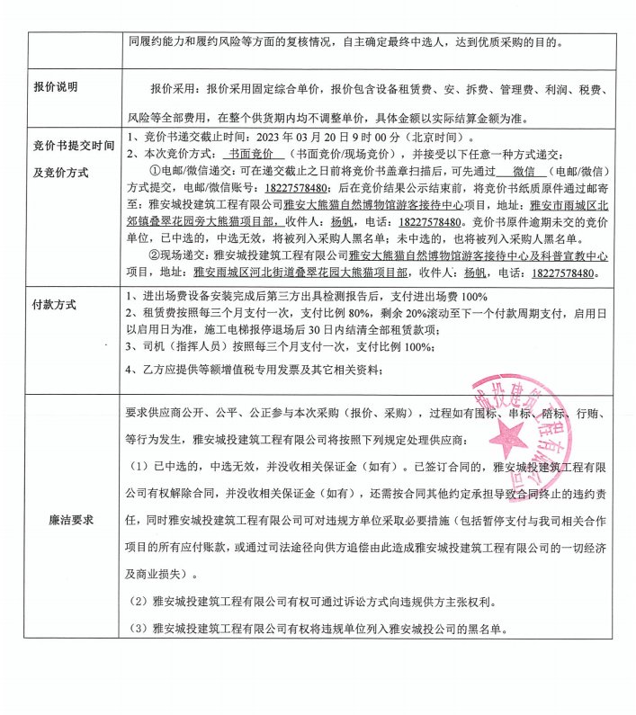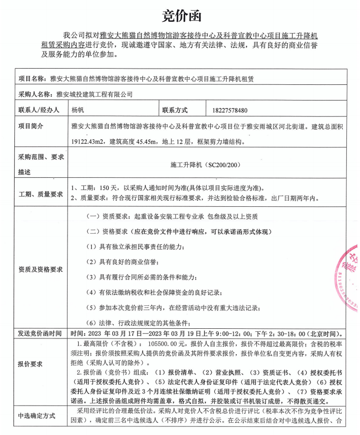 雅安大熊貓自然博物館游客接待中心及科普宣教中心項目施工升降機(jī)租賃采購競價公告