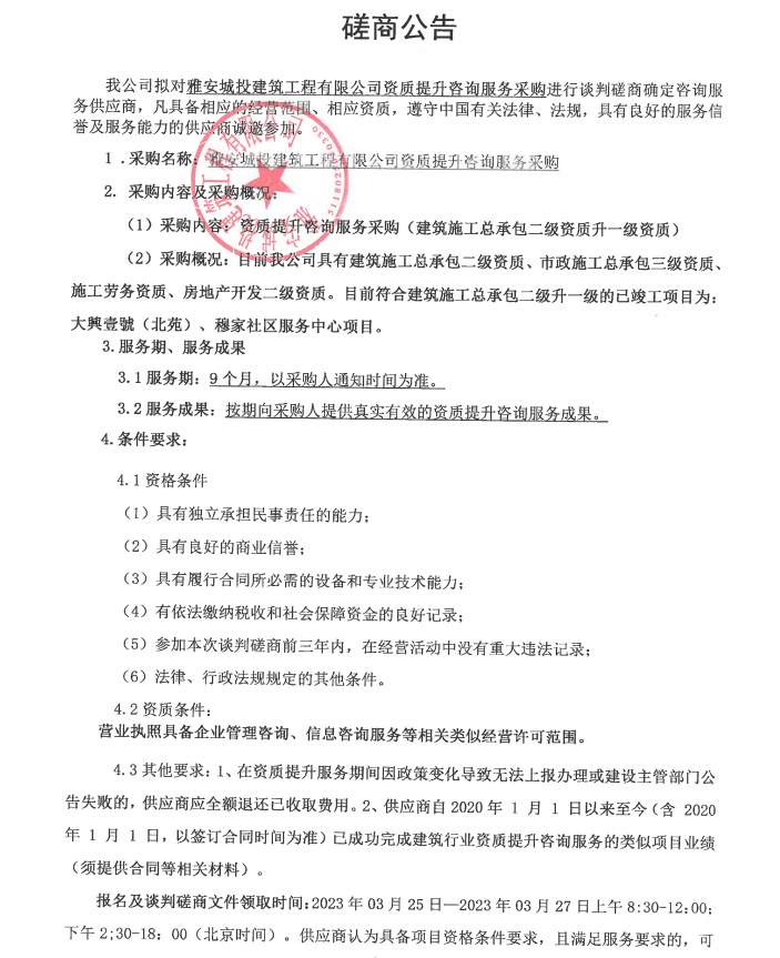 雅安城投建筑工程有限公司資質(zhì)提升咨詢服務(wù)采購磋商公告