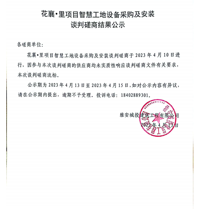 花襄·里項(xiàng)目智慧工地設(shè)采購(gòu)備及安裝談判磋商結(jié)果公示