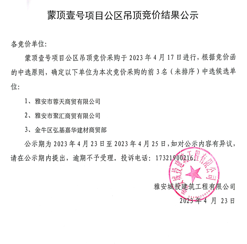 蒙頂壹號(hào)項(xiàng)目公區(qū)吊頂競(jìng)價(jià)結(jié)果公示