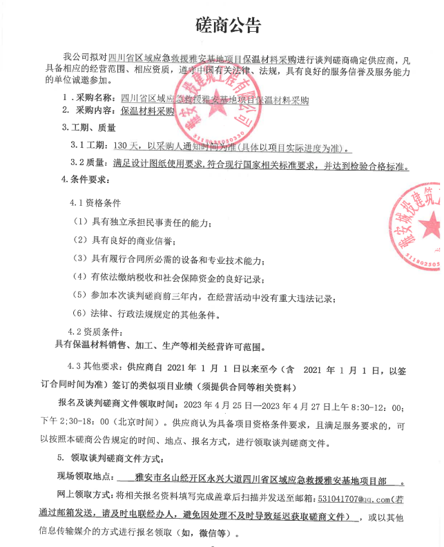 四川省區(qū)域應(yīng)急救援雅安基地項目保溫材料采購談判磋商公告