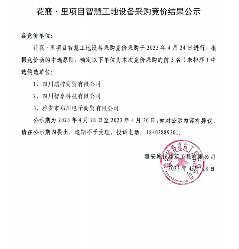 花襄·里項(xiàng)目智慧工地設(shè)備采購(gòu)競(jìng)價(jià)結(jié)果公示