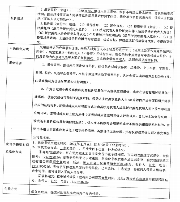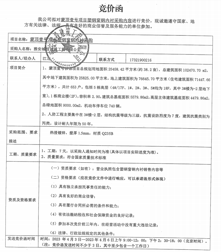 蒙頂壹號項目塑鋼窗鋼內(nèi)襯采購內(nèi)容競價公告