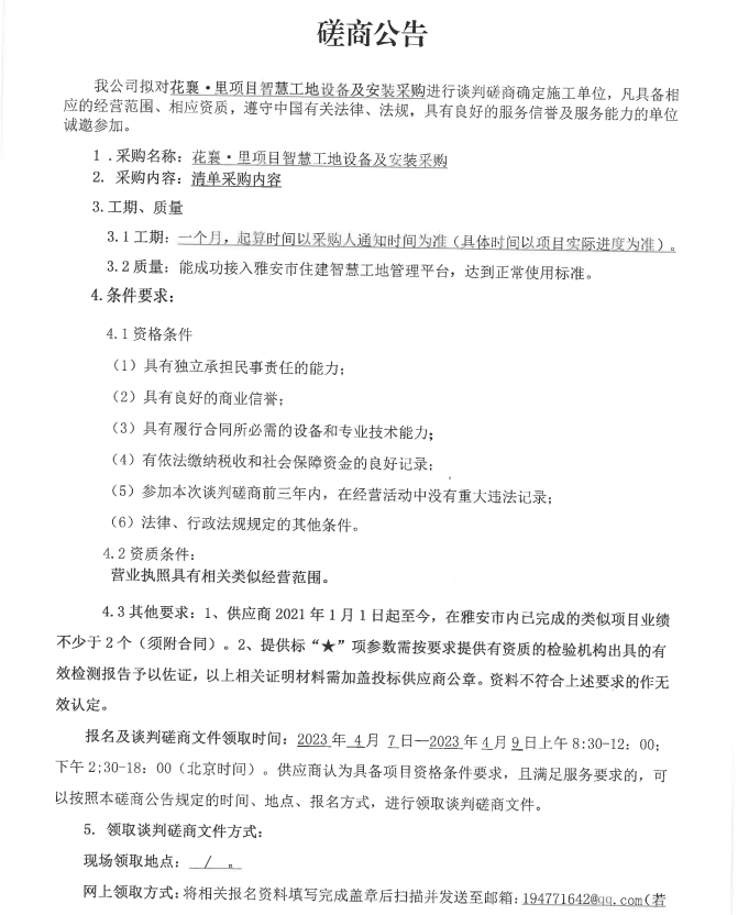 花襄·里項目智慧工地設備及安裝采購磋商公告