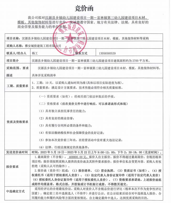 漢源縣鄉(xiāng)鎮(zhèn)幼兒園建設項目一期一富林鎮(zhèn)第三幼兒園建設項目木材、模板、其他裝飾材料等采購競價公告