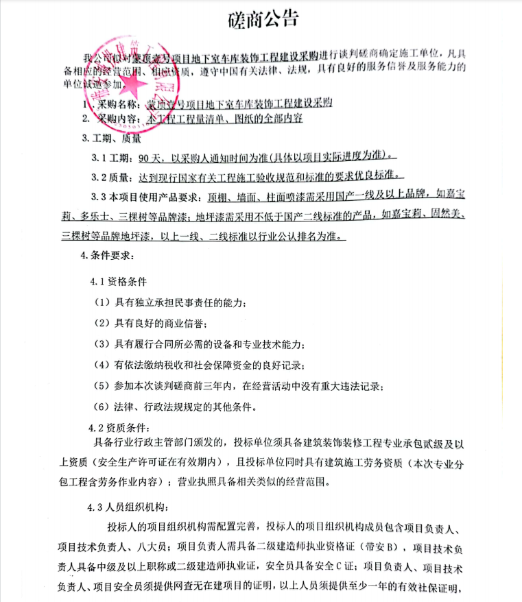 蒙頂壹號(hào)項(xiàng)目地下室車(chē)庫(kù)裝飾工程建設(shè)采購(gòu)談判磋商公告