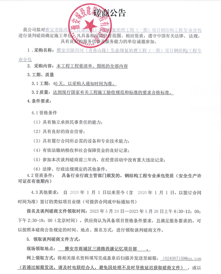雅安市隴西河(青鼻山段)生態(tài)修復(fù)治理工程(一期)項目鋼結(jié)構(gòu)工程專業(yè)分包談判磋商公告