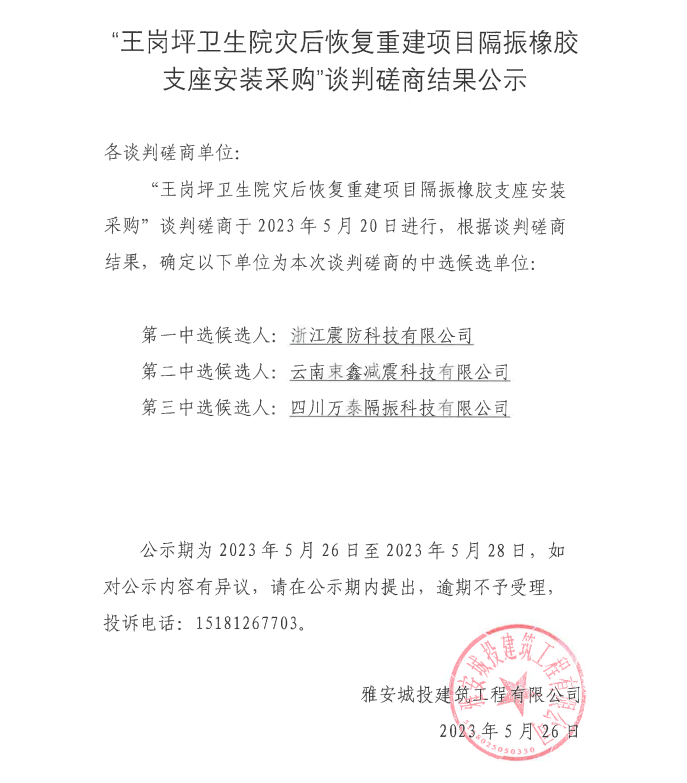 “王崗坪衛(wèi)生院災(zāi)后恢復重建項目隔振橡膠支座安裝采購”談判磋商結(jié)果公示