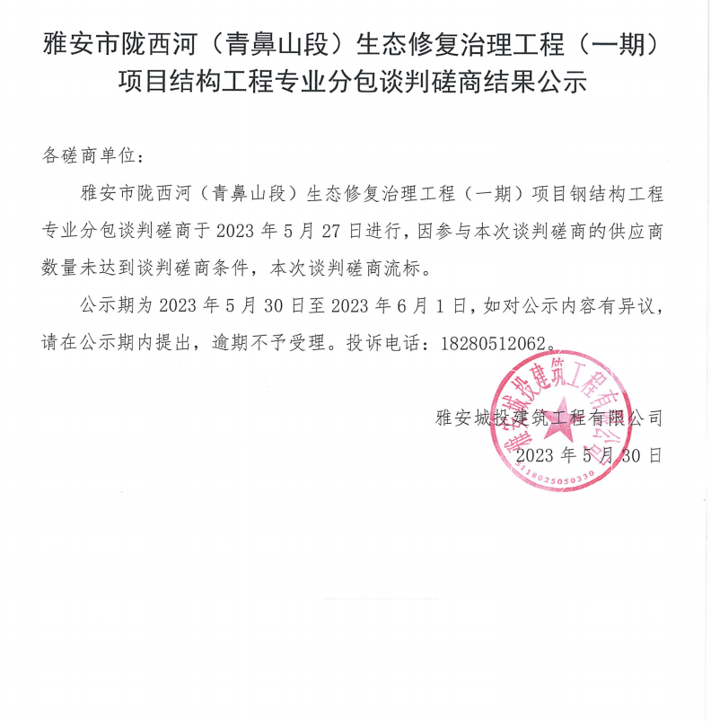 雅安市隴西河(青鼻山段)生態(tài)修復治理工程(一期)項目鋼結(jié)構(gòu)工程專業(yè)分包談判磋商結(jié)果公示