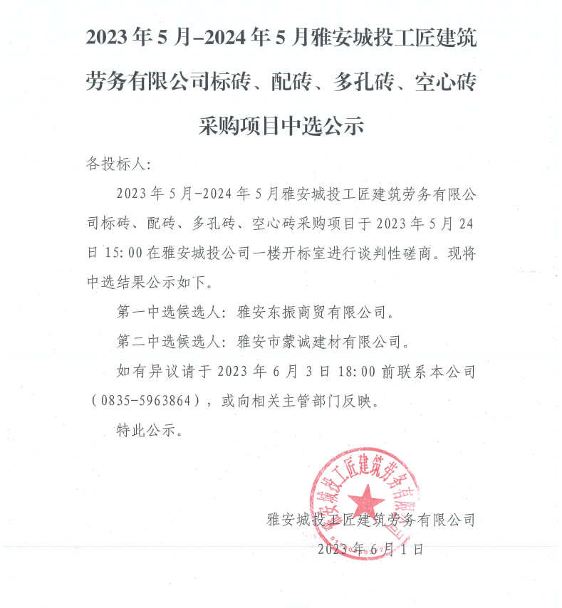 2023年5月-2024年5月雅安城投工匠建筑勞務(wù)有限公司標(biāo)磚、配磚、多孔磚、空心磚采購(gòu)項(xiàng)目中選公示