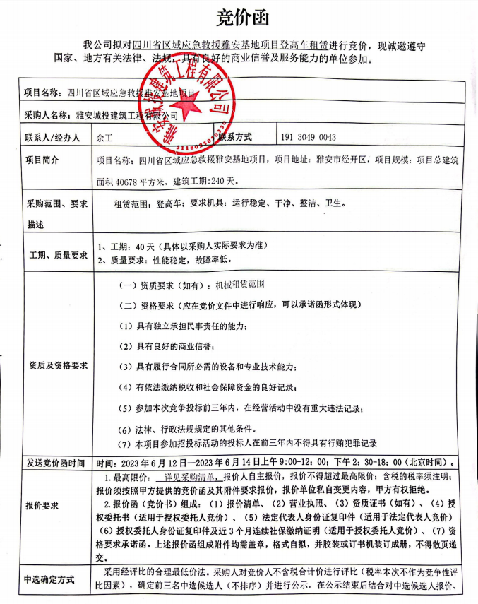 四川省區(qū)域應(yīng)急救援雅安基地項(xiàng)目登高車租賃競(jìng)價(jià)公告