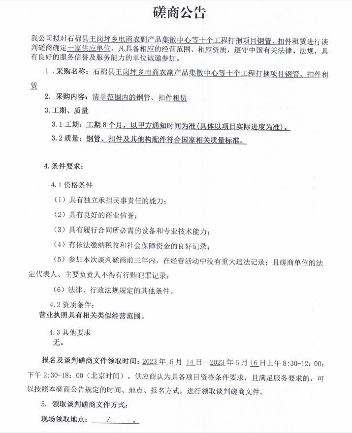 石棉縣王崗坪鄉(xiāng)電商農(nóng)副產(chǎn)品集散中心等十個(gè)工程打捆項(xiàng)目鋼管、扣件租賃談判磋商公告