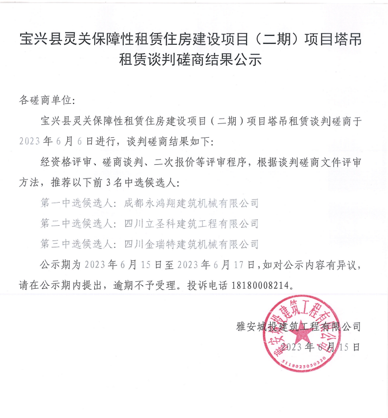 寶興縣靈關(guān)保障性租賃住房建設(shè)項目(二期)項目塔吊租賃談判磋商競價結(jié)果公示