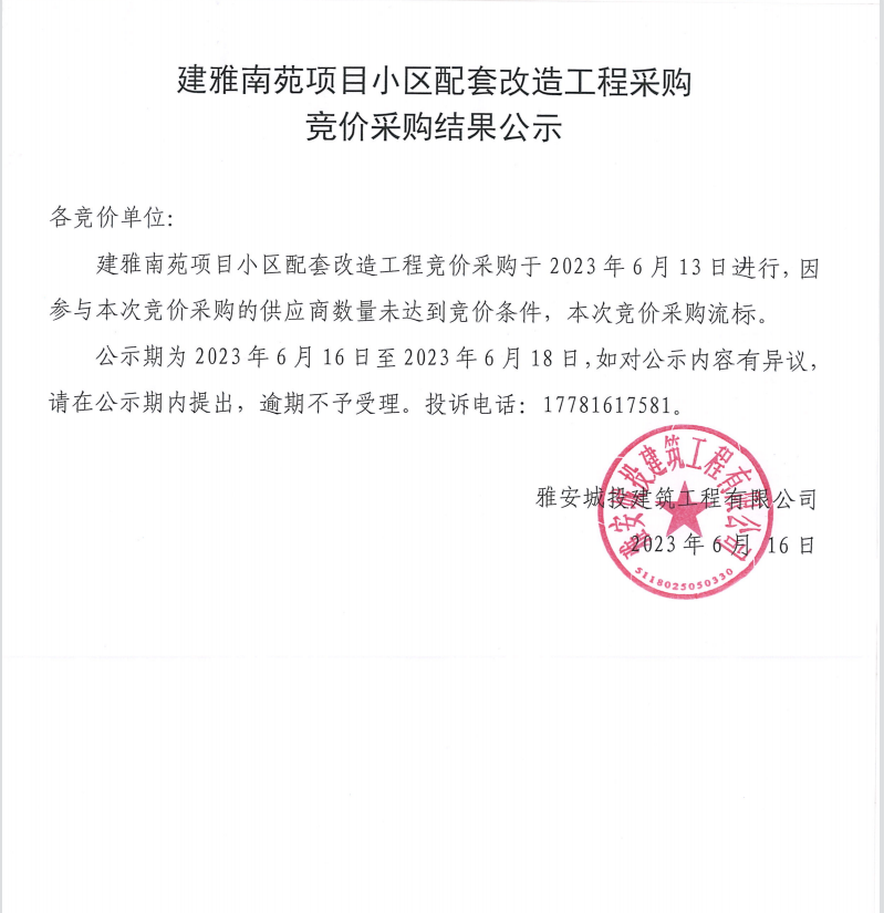 建雅南苑項(xiàng)目小區(qū)配套改造工程采購(gòu)競(jìng)價(jià)采購(gòu)結(jié)果公示