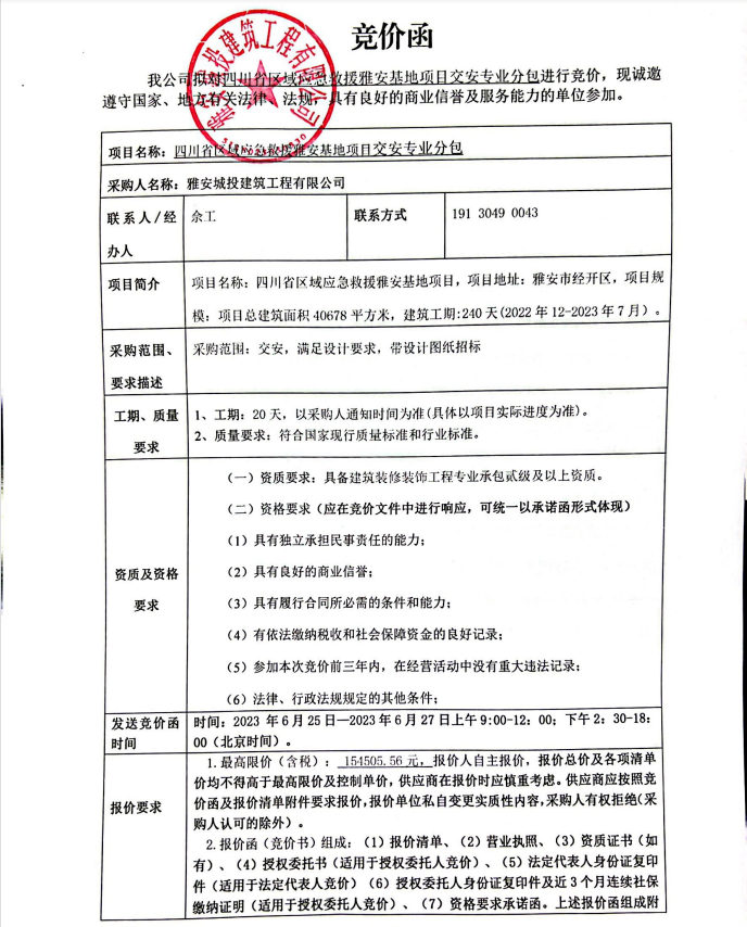 四川省區(qū)域應(yīng)急救援雅安基地項目交安專業(yè)分包競價公告