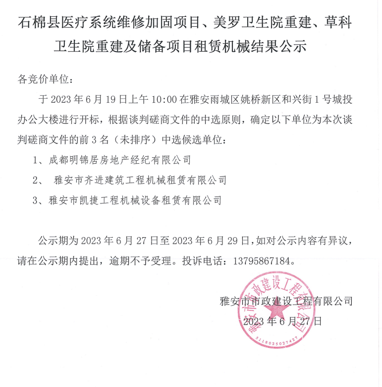 石棉縣醫(yī)療系統(tǒng)維修加固項(xiàng)目、美羅衛(wèi)生院重建、草科衛(wèi)生院重建及儲(chǔ)備項(xiàng)目租賃機(jī)械結(jié)果公示