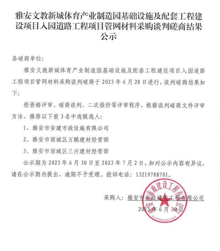雅安文教新城體育產(chǎn)業(yè)制造園基礎(chǔ)設(shè)施及配套工程建設(shè)項(xiàng)目入園道路工程項(xiàng)目管網(wǎng)材料采購談判磋商結(jié)果公示