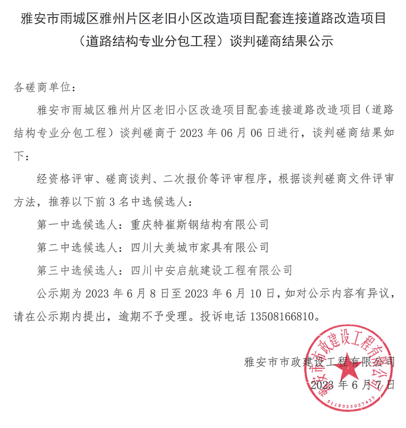 雅安市雨城區(qū)雅州片區(qū)老舊小區(qū)改造項目配套連接道路改造項目(道路結構專業(yè)分包工程)談判磋商結果公示