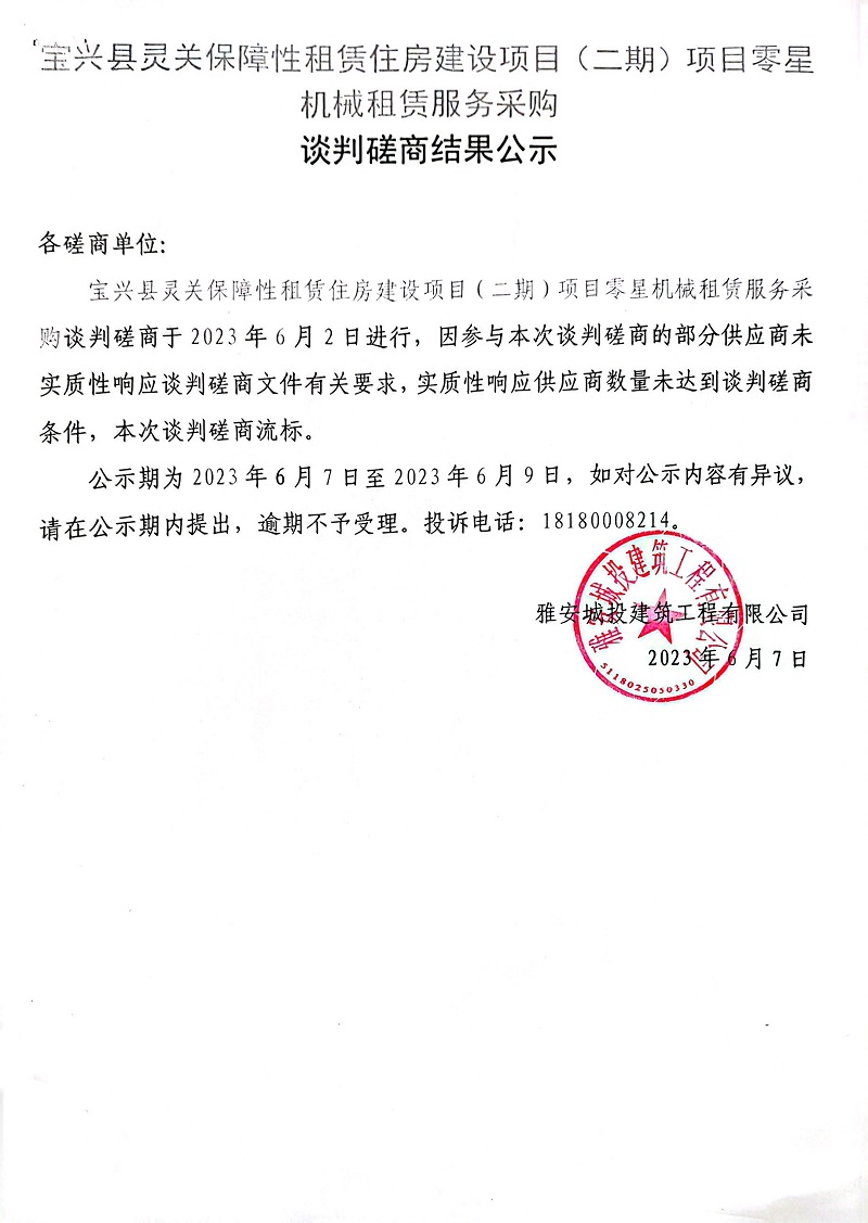 寶興縣靈關(guān)保障性租賃住房建設(shè)項目(二期)項目零星機(jī)械租賃服務(wù)采購談判磋商結(jié)果公示