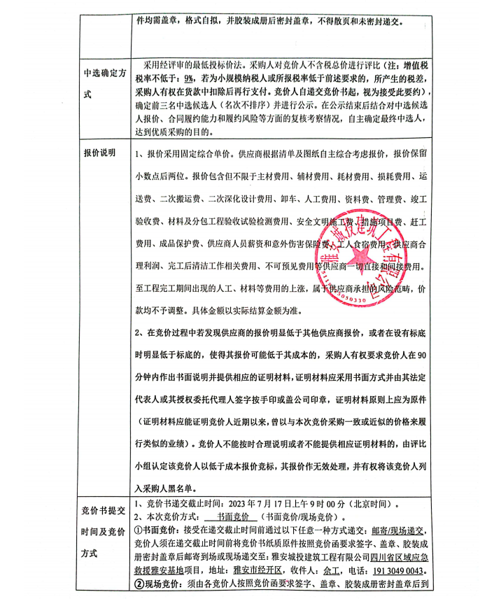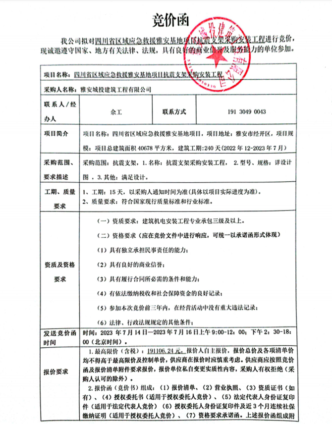 四川省區(qū)域應(yīng)急救援雅安基地項目抗震支架采購安裝工程競價公告